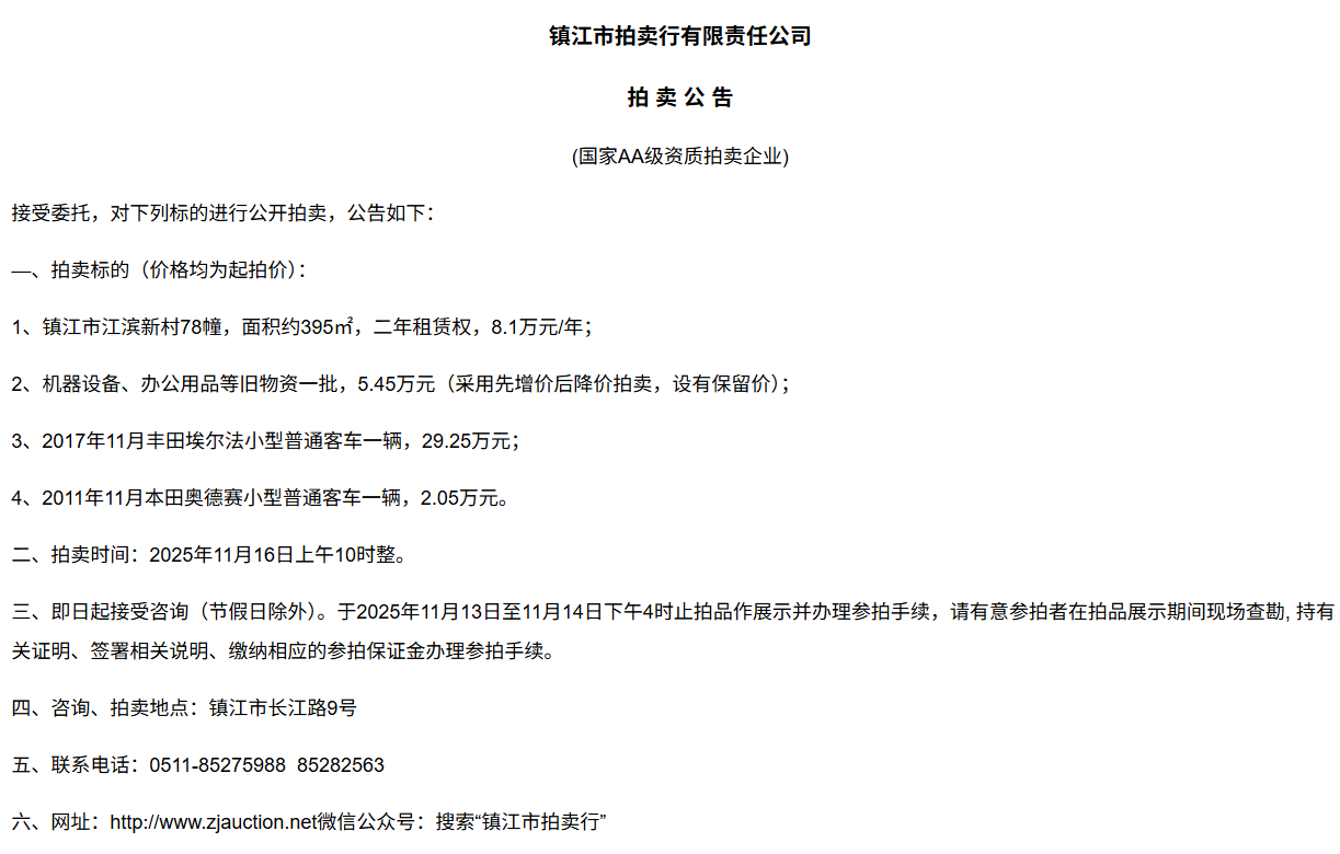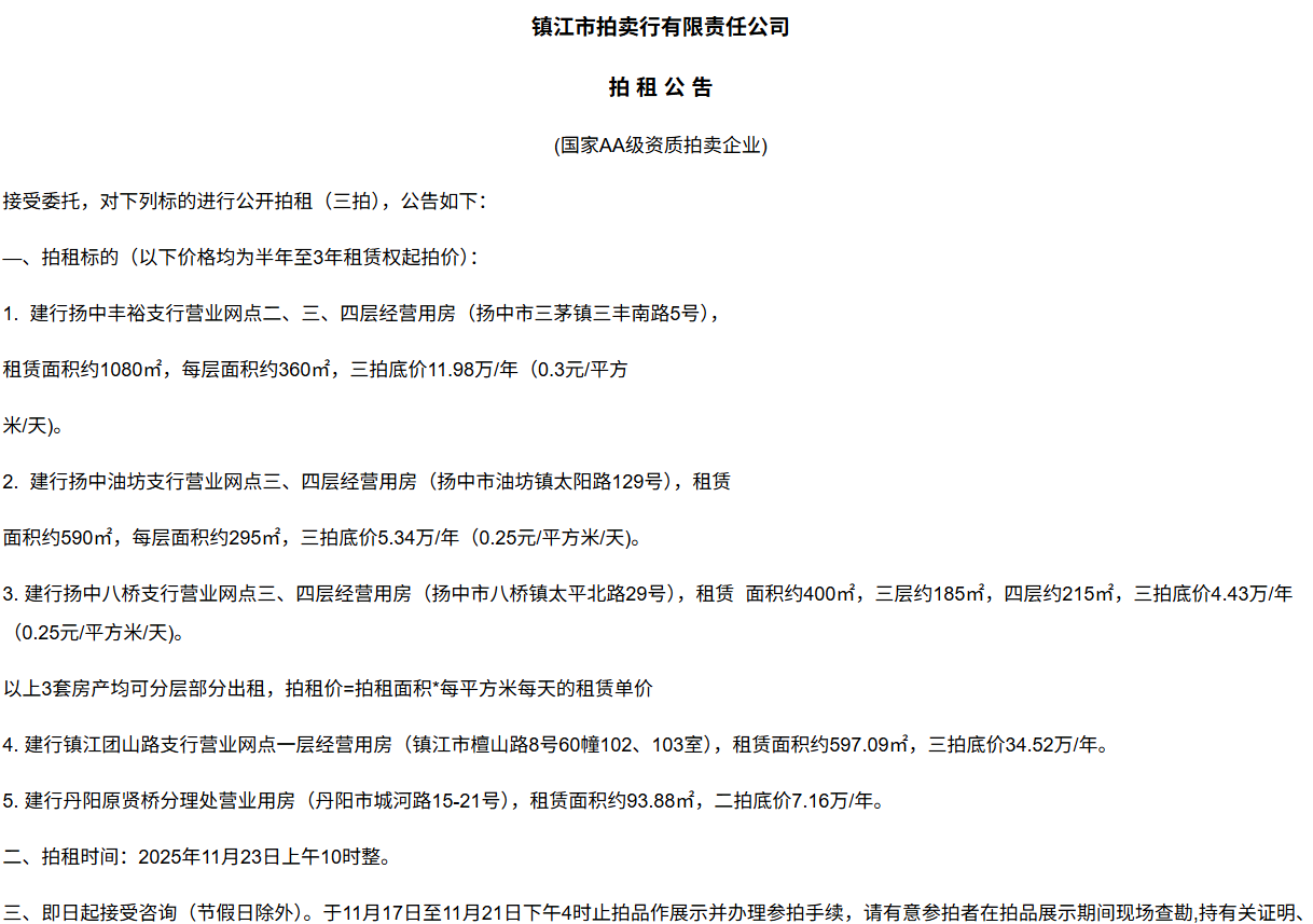 鎮江市拍賣行有限責任公司拍 租 公 吿(國家AA級資質拍賣企業)接受委托,對下列標的進行公開拍租(三拍),公告如下:—、拍租標的(以下價格均為半年至3年租賃權起拍價):1.  建行揚中豐裕支行營業網點二、三、四層經營用房(揚中市三茅鎮三豐南路5號),租賃面積約1080㎡,每層面積約360㎡,三拍底價11.98萬/年(0.3元/平方米/天)。2.  建行揚中油坊支行營業網點三、四層經營用房(揚中市油坊鎮太陽路129號),租賃面積約590㎡,每層面積約295㎡,三拍底價5.34萬/年(0.25元/平方米/天)。3. 建行揚中八橋支行營業網點三、四層經營用房(揚中市八橋鎮太平北路29號),租賃  面積約400㎡,三層約185㎡,四層約215㎡,三拍底價4.43萬/年(0.25元/平方米/天)。以上3套房產均可分層部分出租,拍租價=拍租面積*每平方米每天的租賃單價4. 建行鎮江團山路支行營業網點一層經營用房(鎮江市檀山路8號60幢102、103室),租賃面積約597.09㎡,三拍底價34.52萬/年。5. 建行丹陽原賢橋分理處營業用房(丹陽市城河路15-21號),租賃面積約93.88㎡,二拍底價7.16萬/年。二、拍租時間:2025年11月23日上午10時整。三、即日起接受咨詢(節假日除外)。于11月17日至11月21日下午4時止拍品作展示并辦理參拍手續,請有意參拍者在拍品展示期間現場查勘,持有關證明、簽署相關說明、繳納相應的參拍保證金辦理參拍手續。四、咨詢、拍租地點:鎮江市長江路9號五、聯系方式:0511-85275988   13655299933楊先生六、網址:http://www_zjauction_net.a9c8.cn;微信公眾號:搜索“鎮江市拍賣行” 拍品清單2025.11.23序號名稱起拍價(元)標的說明1建行揚中豐裕支行營業網點二、三、四層經營用房(揚中市三茅鎮三豐南路5號),租賃面積約1080㎡,每層面積約360㎡三拍底價11.98萬/年(0.3元/平方米/天)1、1-3號房產均可分層部分出租,拍租價=拍租面積*每平方米每天的租賃單價;2、意向競拍人在拍賣前需持營業執照或身份證與委托方說明租賃房產經營業態,確定意向后出具房產承租用途承諾書,經委托方審核后,方可交納保證金參加競拍;3、租賃期限為半年至3年(承租方與出租方協商而定),承租方每半年或一年結付租金,租賃期間的水、電費用及其它相關費用均由承租方承擔;4、承租方不得用于經營和保管危險物品,不得用于開設餐飲、娛樂等可能嚴重影響消防安全、運營安全的經營業態,不得用于經營委托貸款、小額貸款等可能冒用委托方名義,帶來聲譽風險的經營業態。租賃期內,承租方不得破壞墻體結構,自行成就消防、安全等使用條件,不得擅自將租賃房屋轉租、轉讓給他人使用,否則委托方有權收回房屋;5、拍租成交后,承租方將租金交至出租方指定賬戶,傭金交至拍賣方賬戶(拍租傭金為該房屋一個月租金)。承租方憑租賃合同無息退還保證金。2建行揚中油坊支行營業網點三、四層經營用房(揚中市油坊鎮太陽路129號),租賃面積約590㎡,每層面積約295㎡三拍底價5.34萬/年(0.25元/平方米/天)3建行揚中八橋支行營業網點三、四層經營用房(揚中市八橋鎮太平北路29號),租賃面積約490㎡,每層面積約245㎡三拍底價4.43萬/年(0.25元/平方米/天)4建行鎮江團山路支行營業網點一層經營用房(鎮江市檀山路8號60幢102、103室),建筑面積約597.09㎡三拍底價34.52萬/年5建行丹陽原賢橋分理處營業用房(丹陽市城河路15-21號),建筑面積約93.88㎡二拍底價7.16萬/年
